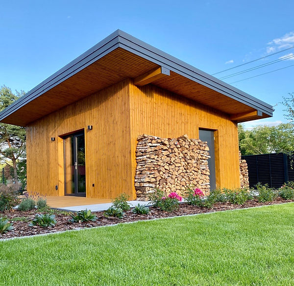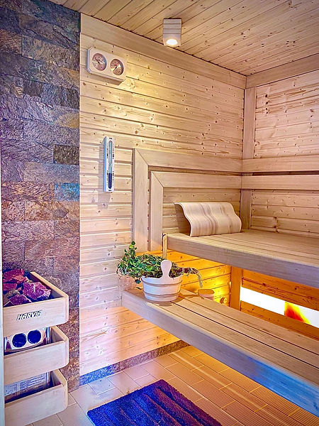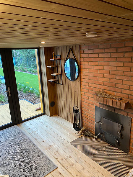 Sauna zewnętrzna z wygodną strefą relaksu.